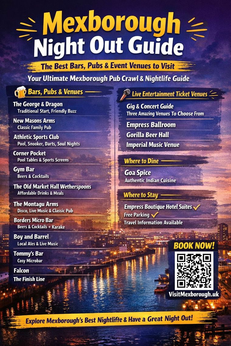 Visitors are increasingly attracted to the town’s popular pub crawl, which begins at the George & Dragon, takes in a classic ten-pub circuit, and finishes at the Falcon. The evening often includes dinner at Goa Spice before concluding at the Empress Hotel, a combination many now regard as the perfect South Yorkshire night out.