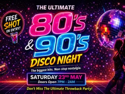 Step back in time at our 80s & 90s Disco Night! Join us Sat 23rd May from 7PM–2AM for iconic hits, neon vibes and non-stop dancing. Enjoy a FREE shot on entry and party all night at the Empress Ballroom. Grab your tickets now for the ultimate throwback!